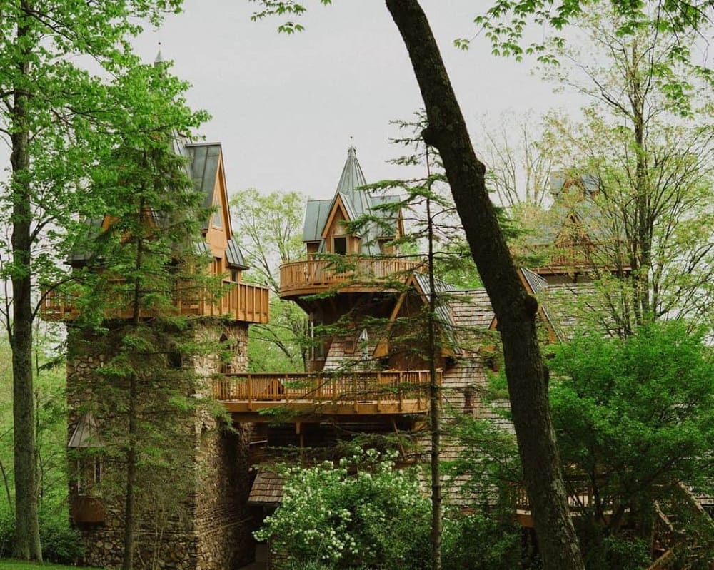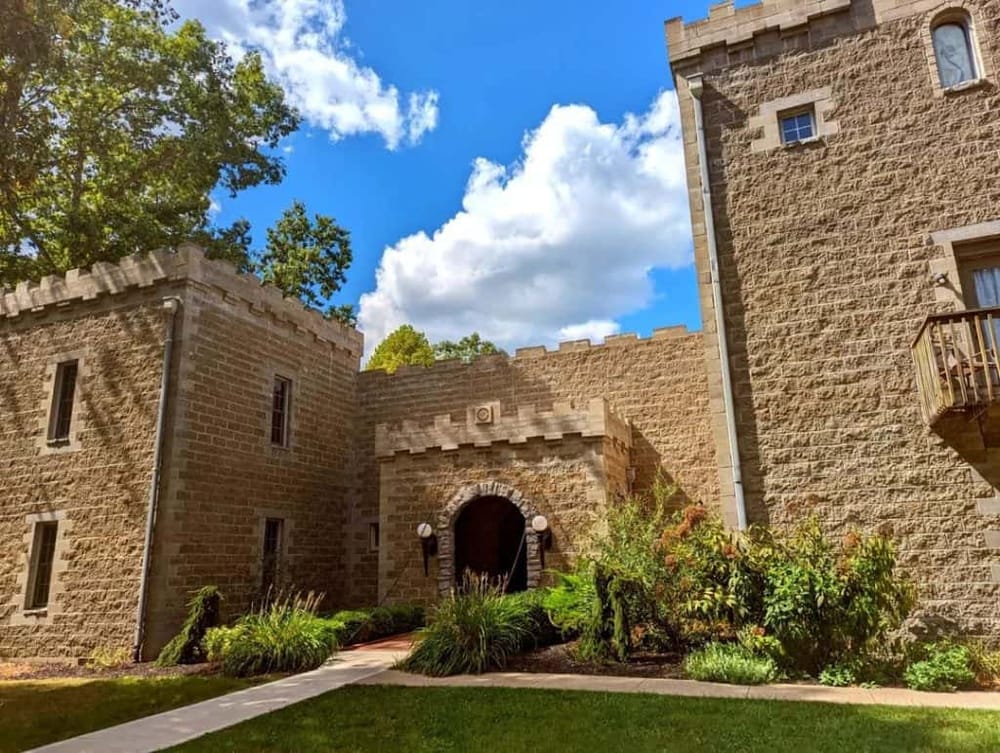 Nestled in the picturesque Hocking Hills region, Ravenwood Castle provides a whimsical touch to your getaway. Designed to mimic a medieval English stronghold, this charming inn presents an array of thematic accommodations for guests. Within the castle-like main building, you can indulge in luxurious options such as the roomy Rapunzel's Tower, located on the top floor, featuring a queen bed, tastefully furnished living area and fireplace.