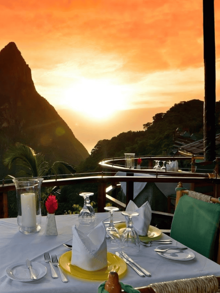 Dasheene Restaurant at the Ladera Resort offers a dining experience with breathtaking views of the Pitons and Caribbean Sea. The setting is perfect for an unforgettable meal, combining stunning scenery with a menu that features local flavors.