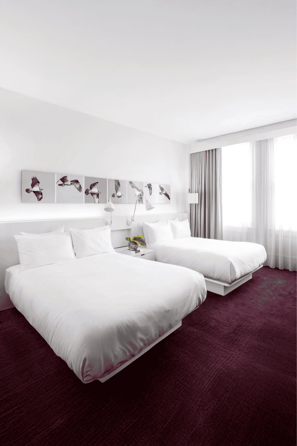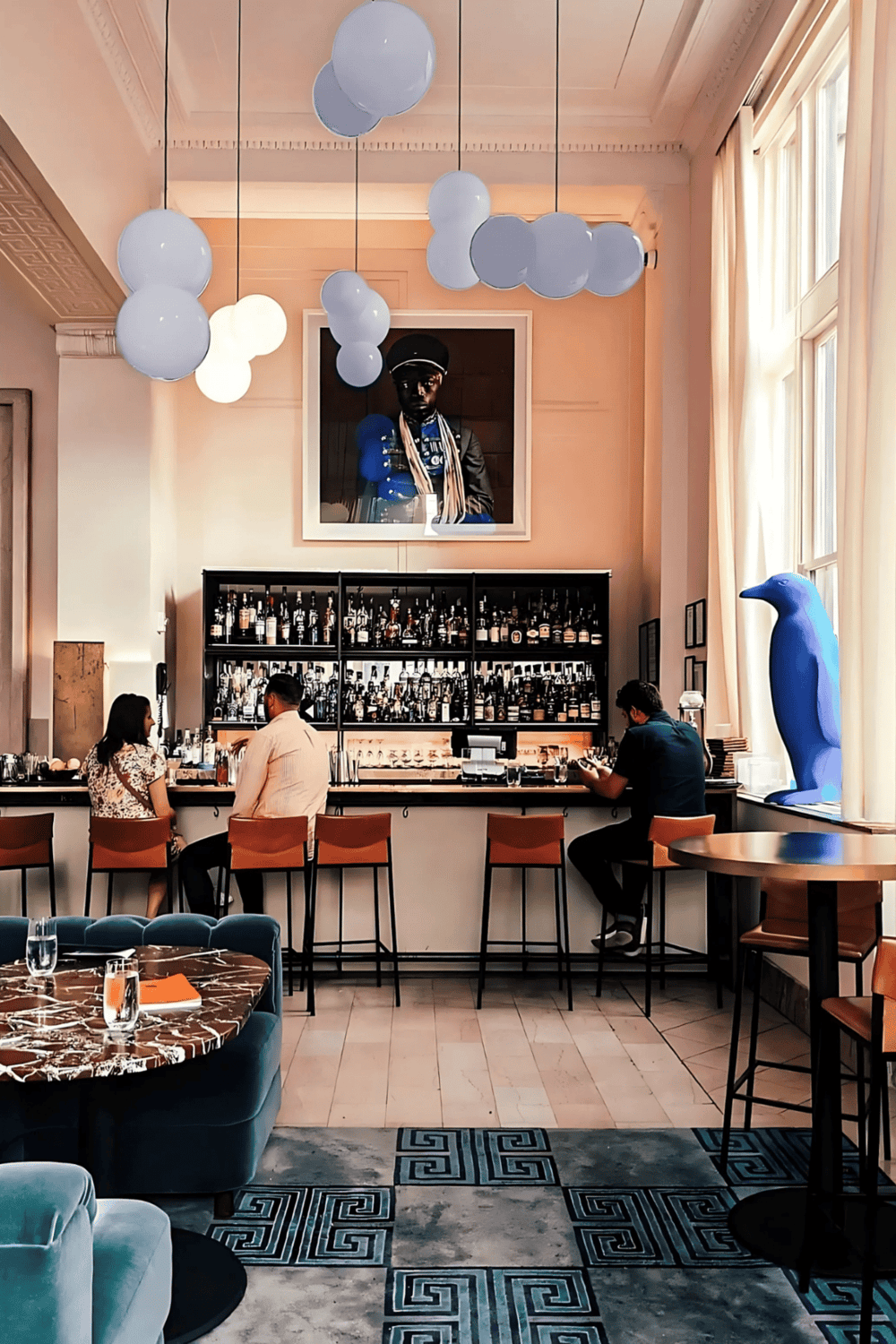 Each floor offers a different rhythm of color, sculpture, and narrative. Playful touches like blue penguin statues in the hallway and rubber ducks in the bathroom add a lighthearted note to the overall sophistication. From photography to mixed-media pieces, the artwork adds dimension and conversation to every corridor.