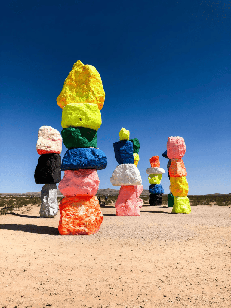 The Seven Magic Mountains await. Picture seven towering stacks of colorful boulders rising from the dusty desert floor. They offer a vivid splash of color against the muted Mojave Desert landscape. Visitors can wander around the sculptures, taking Instagram-worthy photos or simply soaking in the creative, whimsical vibe.