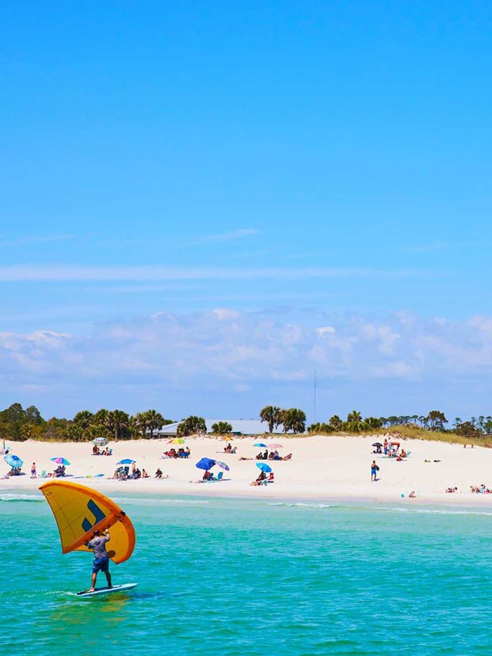 The gentle waves attract paddleboarders while kite surfers glide across the horizon, adding a splash of color to the sky. Throughout the day, beachgoers can enjoy refreshing breezes and keep an eye out for dolphins swimming nearby.