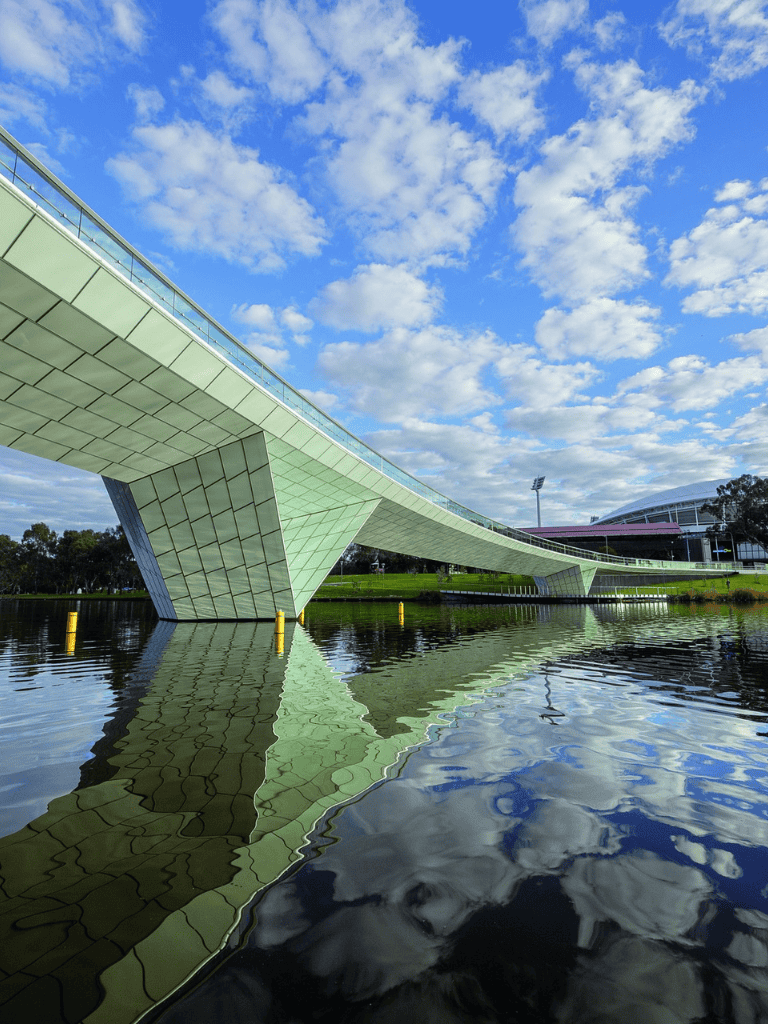 The Riverbank Precinct Pedestrian Bridge is a striking architectural structure connecting the city's key attractions. It links the Adelaide Festival Centre, Adelaide Railway Station, and the vibrant Adelaide Oval. This pathway stretches 255 meters over the stunning River Torrens and is a must-see.
