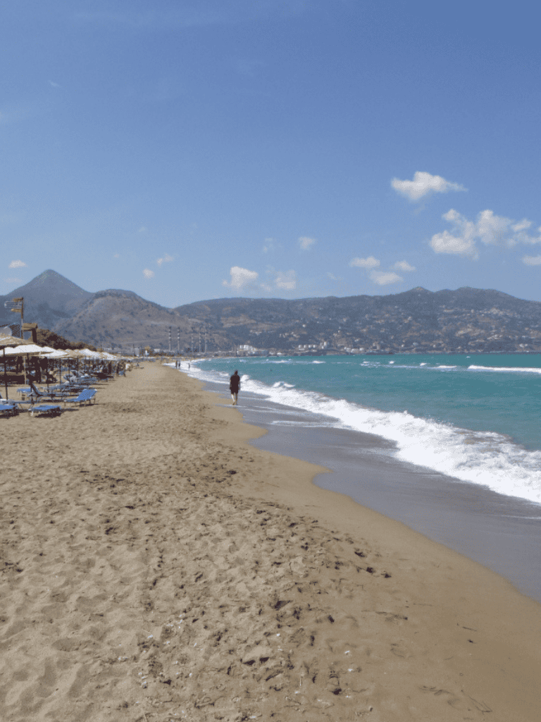 Ammoudara Beach sits just a few miles from Heraklion, making it a popular spot for locals and visitors. This extensive sandy beach has resorts, restaurants, and ample spots to relax under the sun. The atmosphere is lively, with waves inviting people to swim and splash.