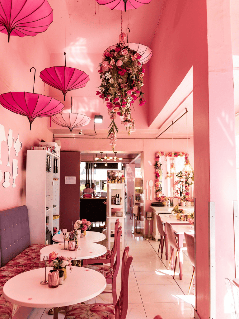 Goddess Cafe Linden is a charming spot in Johannesburg's vibrant city. Visitors enter a pink paradise, where the decor is a feast for the eyes. With beautiful flowers and vintage tea sets, it's a picturesque place for brunch or afternoon tea.
