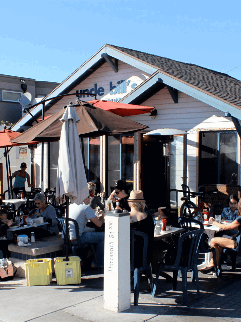 Visiting on a sunny morning allows you to take in the bustling atmosphere. Diners savor their meals while enjoying Manhattan Beach's beachy vibe.