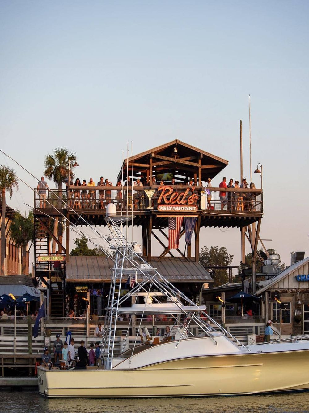 Red's Ice House invites visitors to enjoy a cold beer while indulging in fresh seafood. The restaurant's waterfront location offers unobstructed views of the creek and its wildlife, providing an ideal backdrop for a casual dining experience.