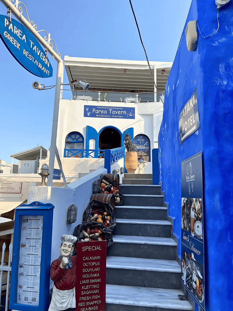 Parea Tavern, situated in the bustling town of Fira, is a gem for those craving authentic Greek cuisine. With its rooftop dining, visitors are treated to stunning views of the Santorini skyline as they enjoy their meals. This spot is perfect for watching the sunset while experiencing the rich flavors of Santorini.