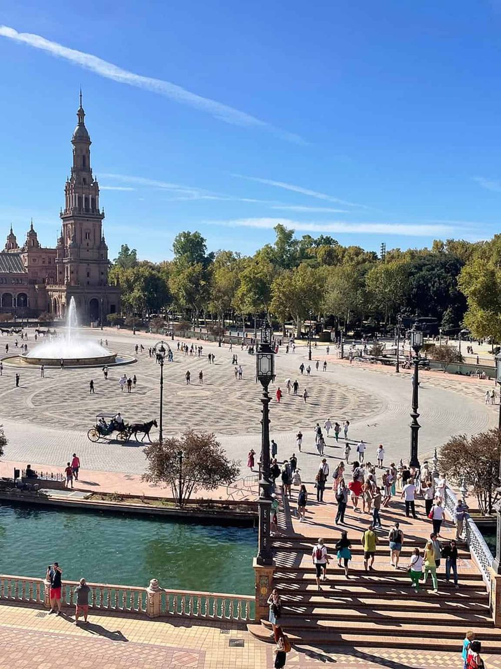 Designed by Aníbal González, it showcases Renaissance Revival and Moorish Revival styles. The plaza's semi-circular shape embraces a large, beautiful canal. Around it are vibrant alcoves representing Spain's provinces, each adorned with colorful tiles. This design signifies a unity among these regions.