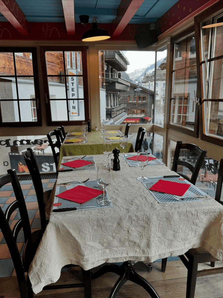 Diners can indulge in the rich flavors of raclette—a classic Swiss dish that promises a memorable taste experience. The warm, rustic setting enhances the charming culinary adventure.
