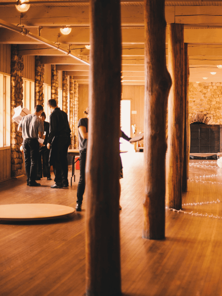 The second floor of the pavilion is available to rent from Memorial Day through Columbus Day. It accommodates up to 300 guests and serves as a venue for weddings, private parties, seminars, and conferences. With stone fireplaces and natural wood beams, the building radiates rustic charm while providing a functional event setting.